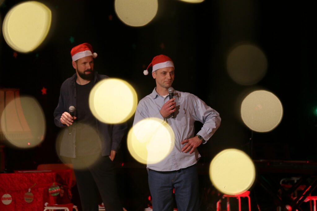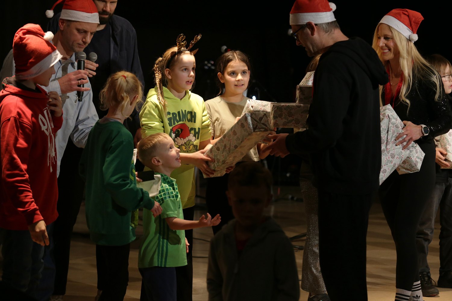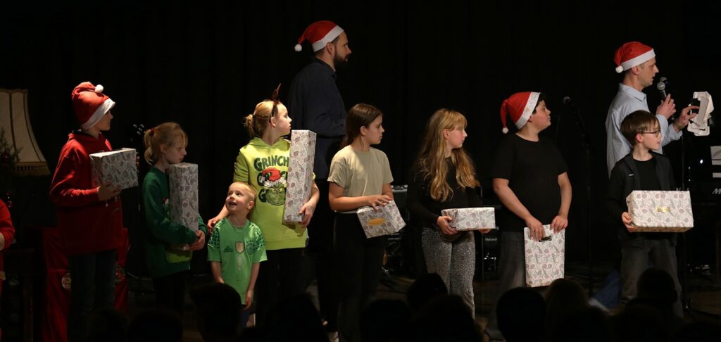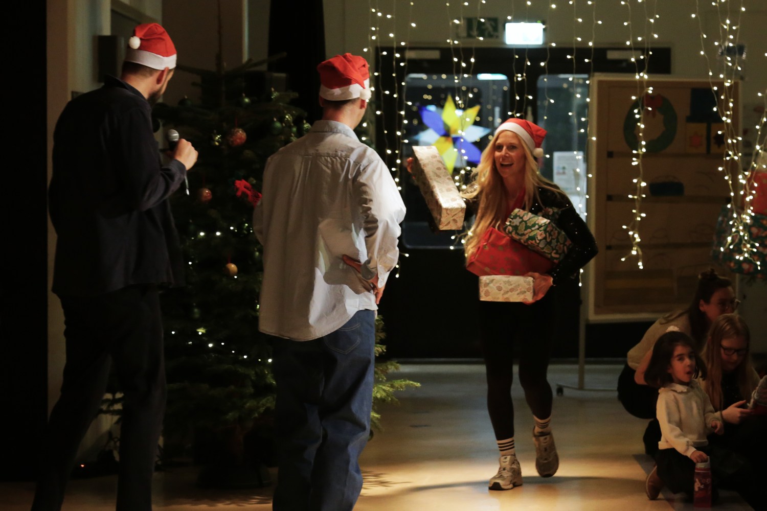 Alles, was jetzt noch zu einer gelungenen Weihnachtsfeier fehlte, waren die Geschenke unter dem Baum. Die Sportlerwichtel und einige Schülerinnen suchten und fanden sie und trugen viele, viele Pakete auf die Bühne. Dabei bemerkten sie, dass 13 Geschenke goldene Aufkleber hatten und sie schwerer waren als die anderen. Herr Wegner und Herr Möller forderten das Publikum dazu auf, in der Pausenhalle nach Hinweisen zu suchen. Sofort wurde eifrig nach oben, unten, rechts und links geschaut, bis ein Gast unter seinem Stuhl einen Zettel fand. Jetzt wurden alle Stühle abgetastet, ob dort ein Zettel klebt. 13 Schüler*innen, von der Aufforderung ein wenig verwirrt, kamen auf die Bühne und erhielten jeweils alle ein unterschiedlich großes Geschenk von den drei Sportlerwichteln. Tadaa! Ein Weihnachtsgeschenk der Schule!