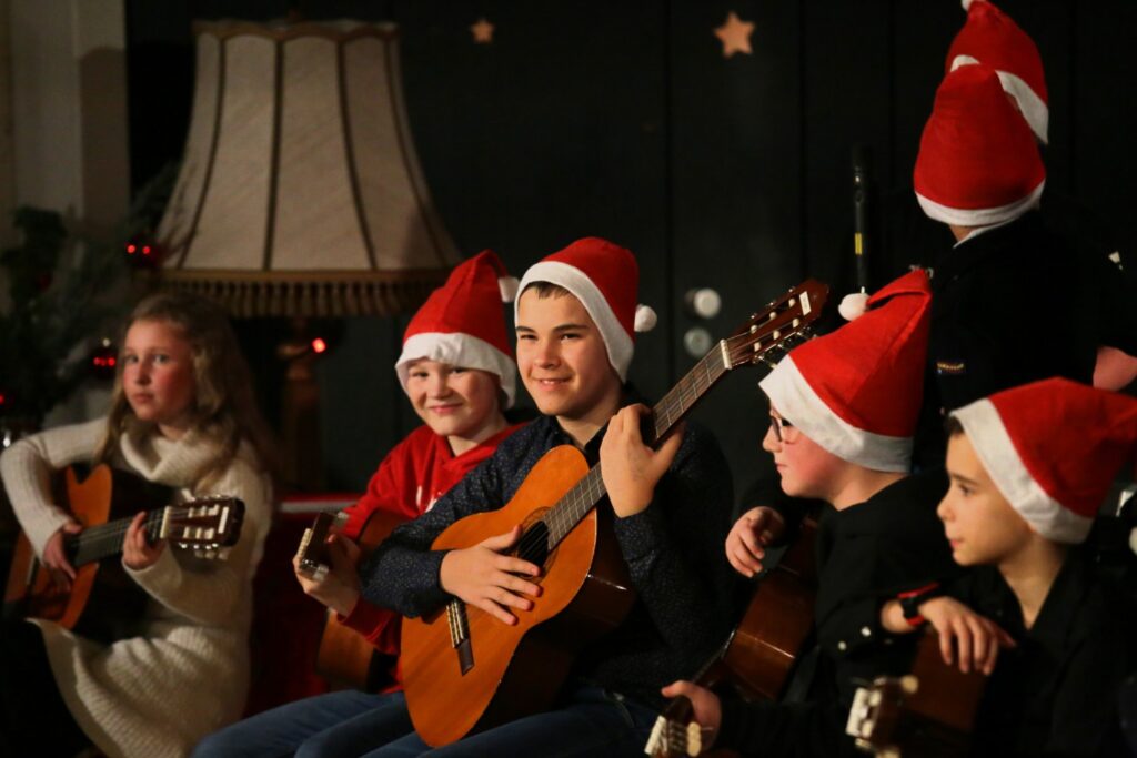 © 7Nach dem Applaus räumten die Kinder schnell ein paar Sachen auf der Bühne um und sangen und spielten auf Gitarren und einem Keyboard Feliz Navidad. Ihre roten Zipfelmützen wippten im Takt. Großartig war der Auftritt!