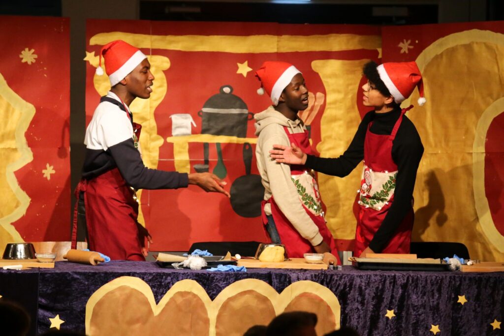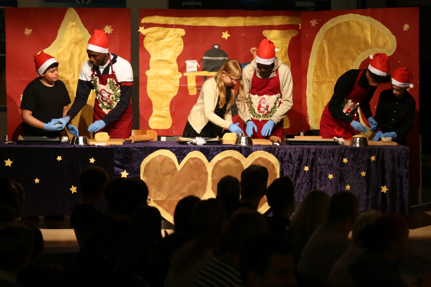 Neben der Bühne hatten sich drei Schüler aus unserem Cateringteam als Weihnachtswichtel an einen Tisch gesetzt und stritten darum, wer schneller 15 Plätzchen backen kann. Herr Wegner und Herr Möller riefen also einen kleinen Wettstreit aus und zwei freiwillige Schüler und eine Schülerin aus dem Publikum durften zusätzlich die Hilfswichtel der Backwichtel sein. Um die drei Wichtelteams anzutreiben, sang das Publikum mit Frau Fendel erst langsam und dann immer schneller „In der Weihnachtsbäckerei“. Drei Sportlerwichtel – Frau Wiedemann, Herr Pörschke und Herr Rath – lieferten sich nach dem Plätzchenausstechen einen Wettkampf, wer schneller mit den Plätzchen am Ofen ankommt. Und weil die Plätzchen ja schön knusprig braun aussehen sollten, las Herr Lerch derweil eine Weihnachtsgeschichte vor.