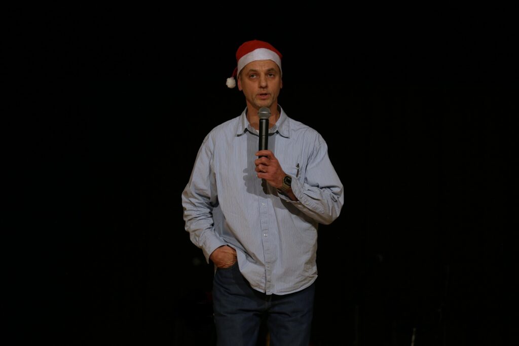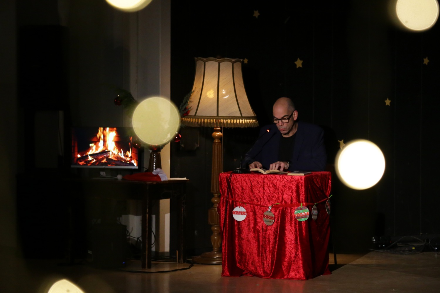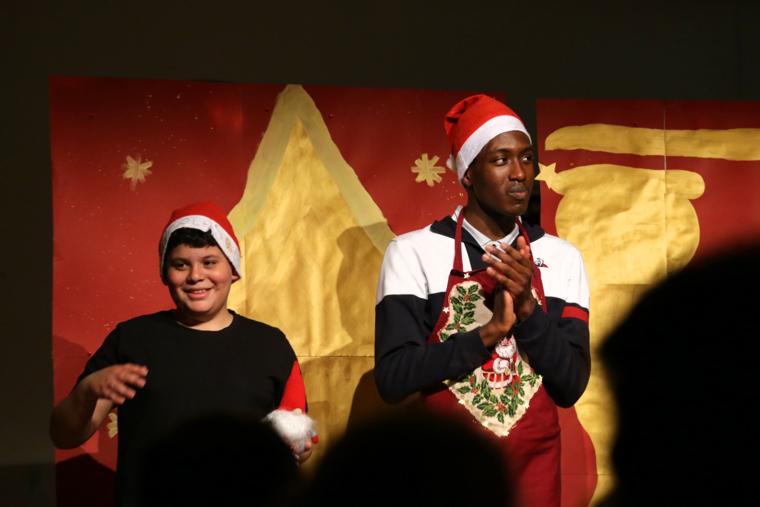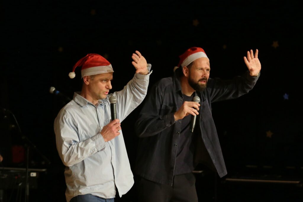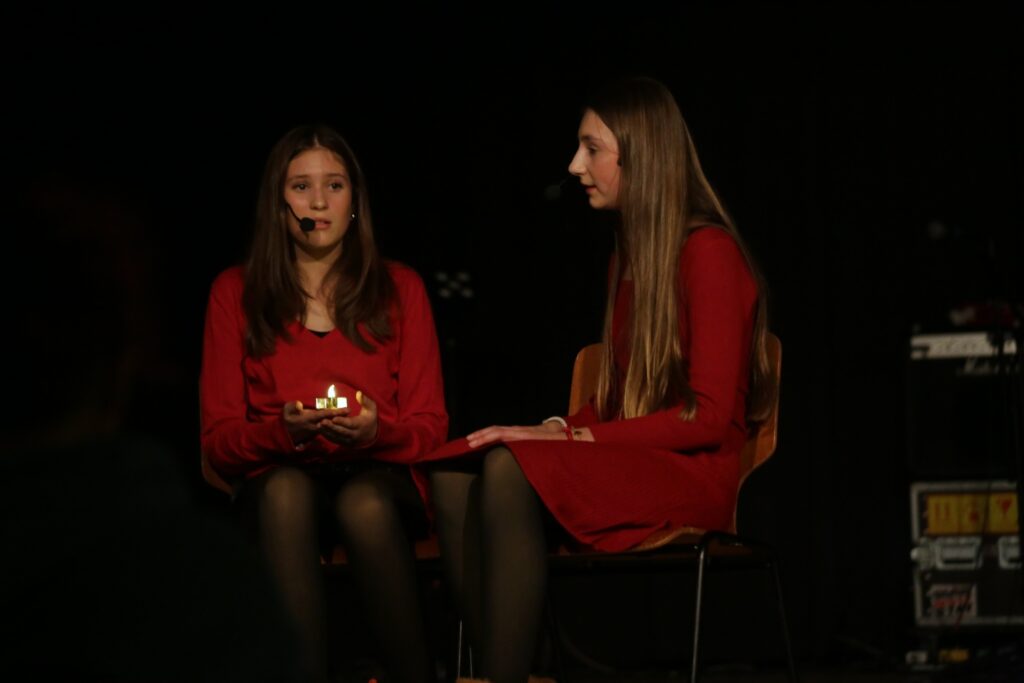Nach dem Applaus kündigten die Moderatoren eine kleine Theateraufführung von Herrn Kuhlmann an. Und auch der Auftritt war wie die Geschichte von Herrn Lerch sehr schön gestaltet, es ging einem sehr zu Herzen. Die zwei jungen Schülerinnen verkörperten 2 Mädchen/ Frauen und zeigten, dass Weihnachten, eine sonst so besinnliche Zeit, auch traurig sein kann aus verschiedenen Gründen. Man soll aber deshalb nicht in ein Loch fallen, auch mit Freunden kann man Weihnachten feiern, nicht nur mit der Familie.
