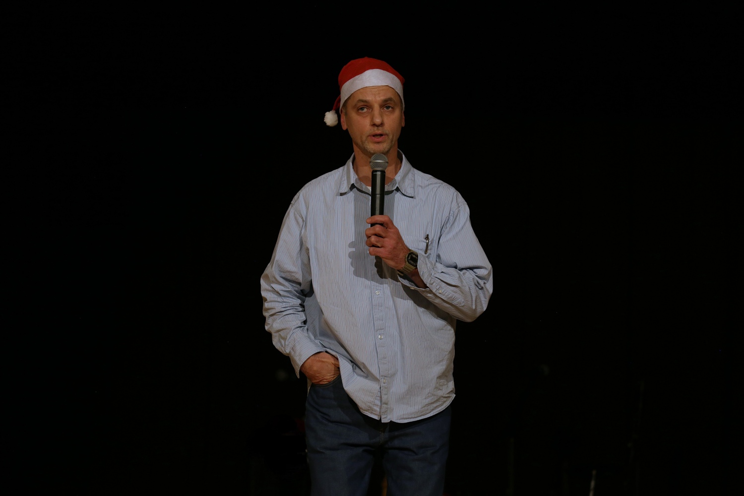 Herr Möller und Herr Wegner waren für den Abend die Moderatoren. Die beiden Lehrer kündigten als Erstes einen musikalischen Auftritt von der 5d und der 6g an. Mit Herrn Lange und Frau Jahn als Sänger und Herrn Drews, Herrn Eid, Herrn Klein, Herrn Waschik und Frau Fendel an den Instrumenten wurde Last Christmas in wunderschönen Tönen gesungen.