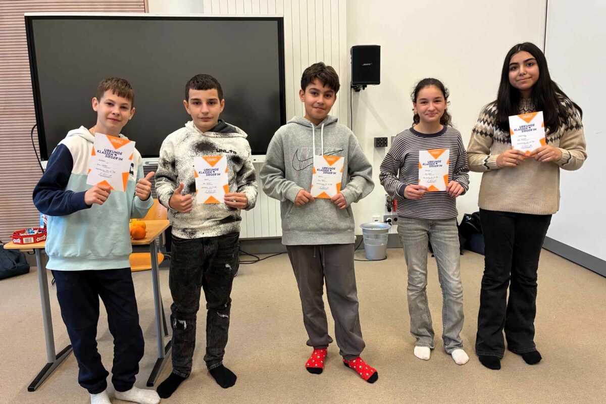 Die Klasse 6a sorgte im Publikum für eine tolle Stimmung und unterstützte die Vorleserinnen und Vorleser immer wieder mit kräftigem Applaus. Die Teilnehmerinnen und Teilnehmer zeigten beeindruckende Lesefähigkeiten und machten den Wettbewerb zu einem sehr schönen Erlebnis für alle Anwesenden. Die Jury, bestehend aus den OberstufenschülerInnen Ruken Oruk, Aleyna Dingil, Nisanur Tugrul, Simon Helf und Nehme Boussi hatten es nicht leicht, die SiegerInnen zu bestimmen.